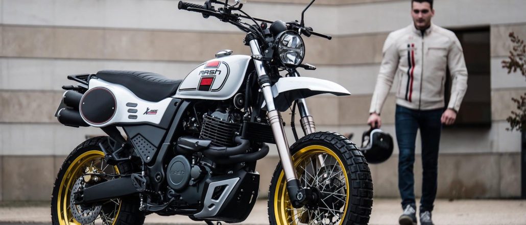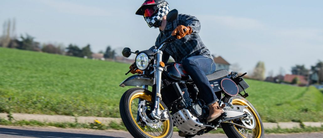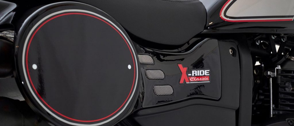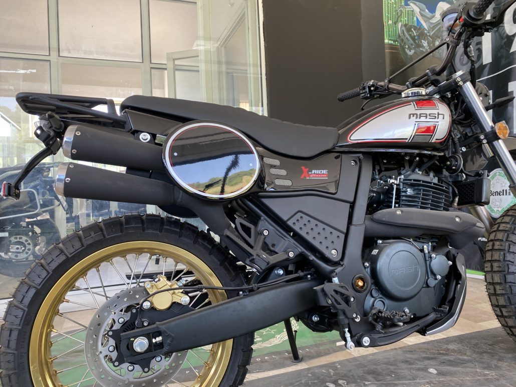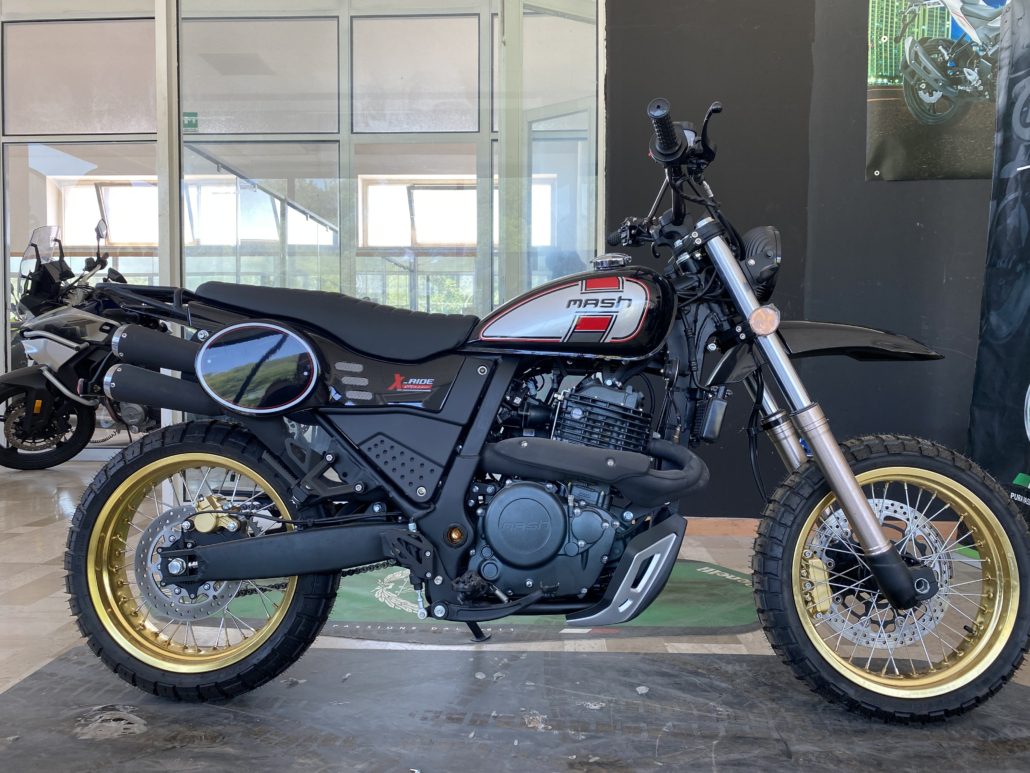 Nuova scrambler X RIDE 650 ABS Euro 5 Vintage Style: monta un motore monocilindrico di 647 cc omologato Euro 5, capace di sviluppare 40 CV di potenza, solo 160 Kg a secco, cerchi da 17″ a raggi con il canale anodizzato oro e sospensione posteriore monoshock.
